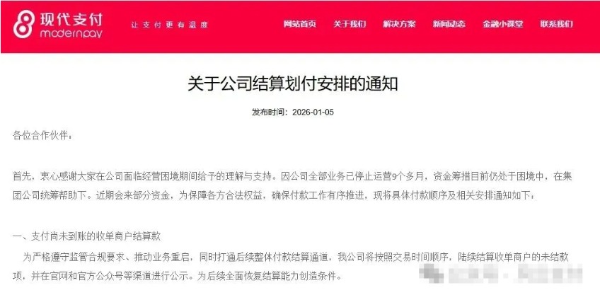 前些日子,现代金控发布了一则通知,宣称已统筹好部分资金,正式开启收单商户结算款的兑付工作。