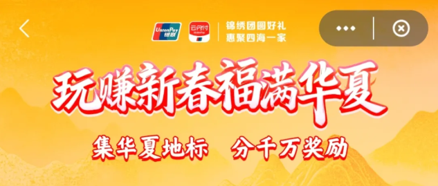 而云闪付将于2月6日开启“玩赚新春福满华夏”活动,集华夏地标,分千万奖励,云闪付春节活动也将成为“支付宝集福啦”有力的竞争者!