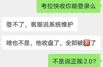 昨日,多位2.0盟友向瑞升达小编爆料,2.0圈子牛逼的2.0产品——考拉快收封盘了,分润已经很长时间没有发放了,并且该平台APP登录已经提示报错。无法正常登录了! 据小瑞了解,考拉快收在最牛逼的时候大致有近1百亿的交易量,也能称得上能赚钱的2.0产品了。后来由于平台创始人又去搞了其他2.0平台,重心也转移。很多代理商也跟着跑到了新平台,考拉快收就慢慢的退出,现在基本没啥人知道该产品。 平台封盘收盘后不少卡拉快收在朋友圈、盟友群发表言论,表示请火速停用手上的考拉快收POS机,费率已经涨成了天价。 也有盟友问:不是讲这是正规2.0吗?怎么还收割呢?支付行业到底还能不能干??到底还有没有好大哥?好...
